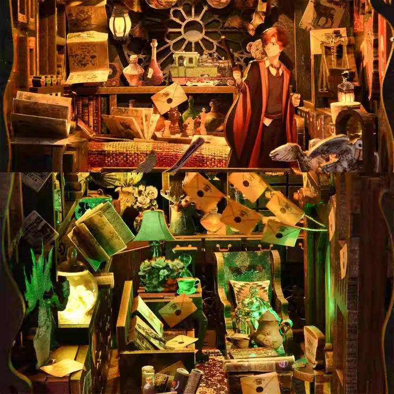 DIY Wooden Book Nook Kit – Magic House 3D Miniature Bookend Model with LED Lights